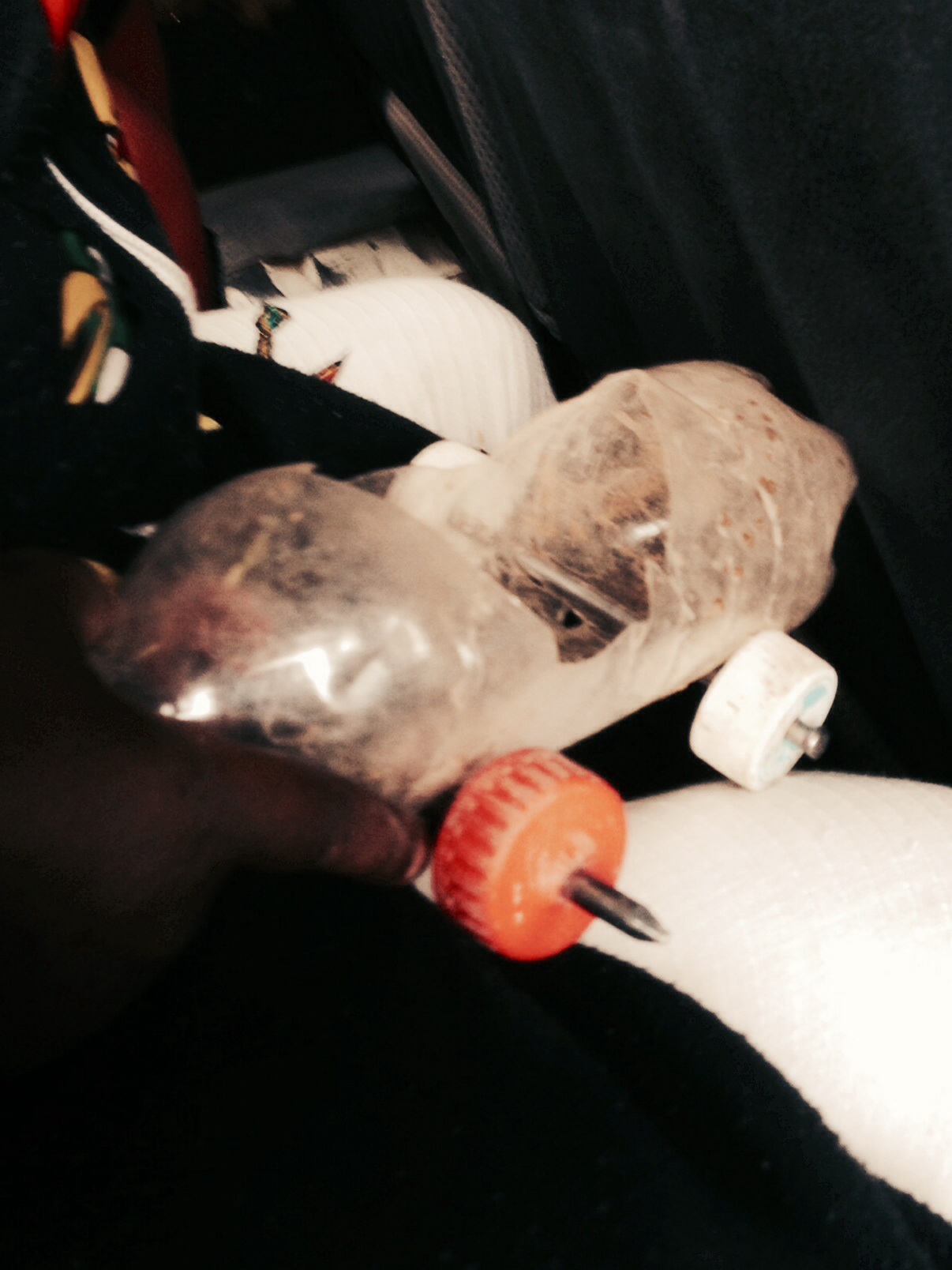 On that subject, I happened to notice the little 3 or 4 yr old kid sitting beside me on the bus the other day, treasuring what was maybe her only toy: a car, made from a plastic water bottle, with bottle caps for wheels. She was gripping it as if it was the most precious thing in the world. (Bad photo, snapped furtively with my iPhone, but you get the idea.)